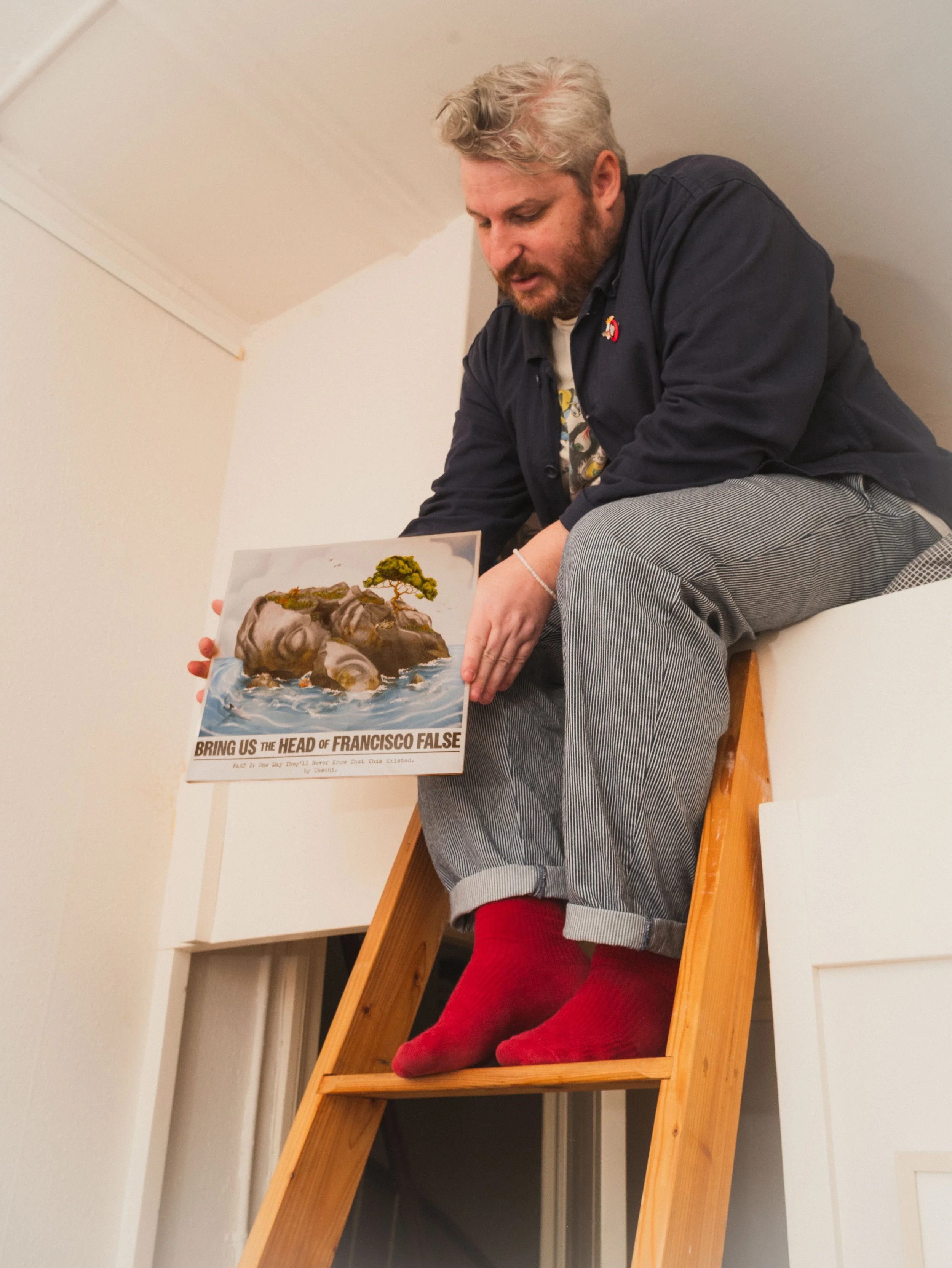 He shows us his collection of black gold. Album covers he's designed over the years. Tonnes and tonnes of them, all amazing. Being vinyl junkies ourselves, this is the favourite part of our time there.